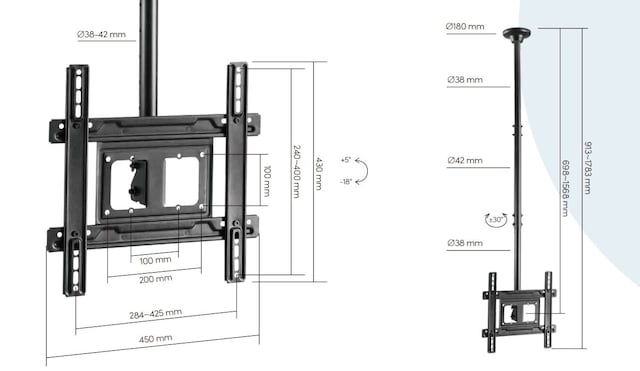 Takfästet är anpassat för TV-skärmar från 32 till 70 tum och klarar en maxvikt på 50 kg. Den justerbara profilen på 698–1568 mm från taket gör det enklare att anpassa höjden efter rummets förutsättningar och önskad tittarvinkel. Fästet har även lutningsfunktion från +5 till -18 grader samt svängfunktion från +30 till -30 grader, vilket ger större flexibilitet vid installation och användning.
