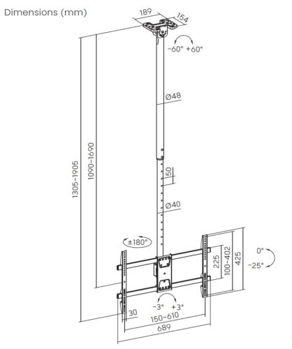 Takfästet är anpassat för TV-skärmar från 37 till 86 tum och klarar en maxvikt på 60 kg. Den teleskopiska höjdjusteringen mellan 1090 och 1690 mm gör det enkelt att anpassa skärmens höjd efter rummets förutsättningar och önskad tittarvinkel. Fästet har dessutom lutningsfunktion från 0 till -25 grader, svängfunktion från +180 till -180 grader och möjlighet till nivåjustering på +3 till -3 grader, vilket ger stor flexibilitet vid installation och användning.