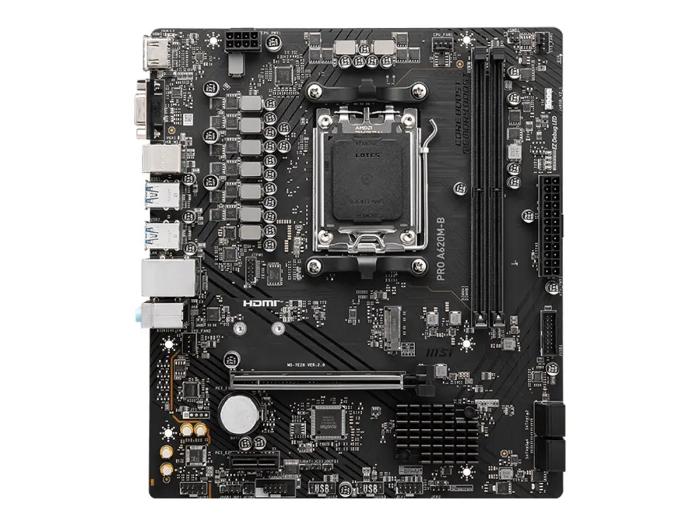 MSI Pro A620M-B är ett micro-ATX-moderkort som erbjuder stabilitet, effektivitet och funktionalitet för användare som bygger med AMD:s senaste AM5-processorer. Perfekt för dig som vill ha ett pålitligt moderkort för vardagligt bruk, kontorsarbete eller enklare gaming.